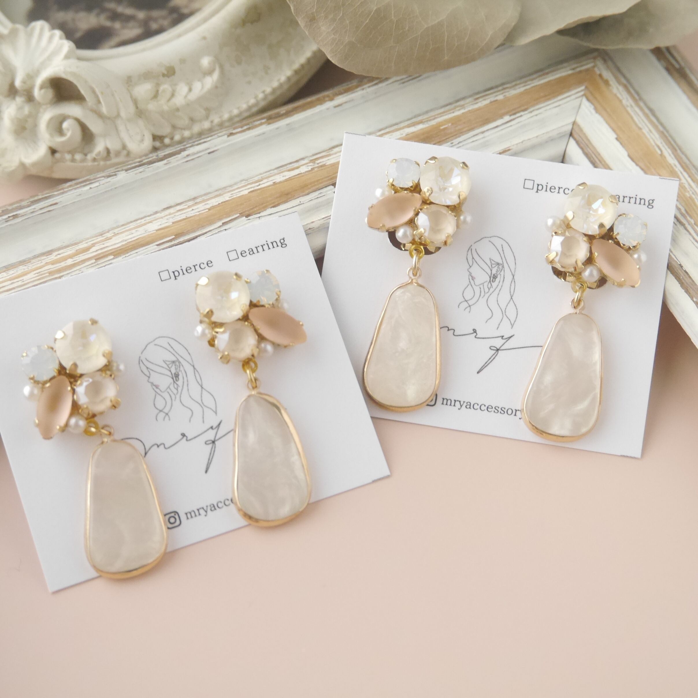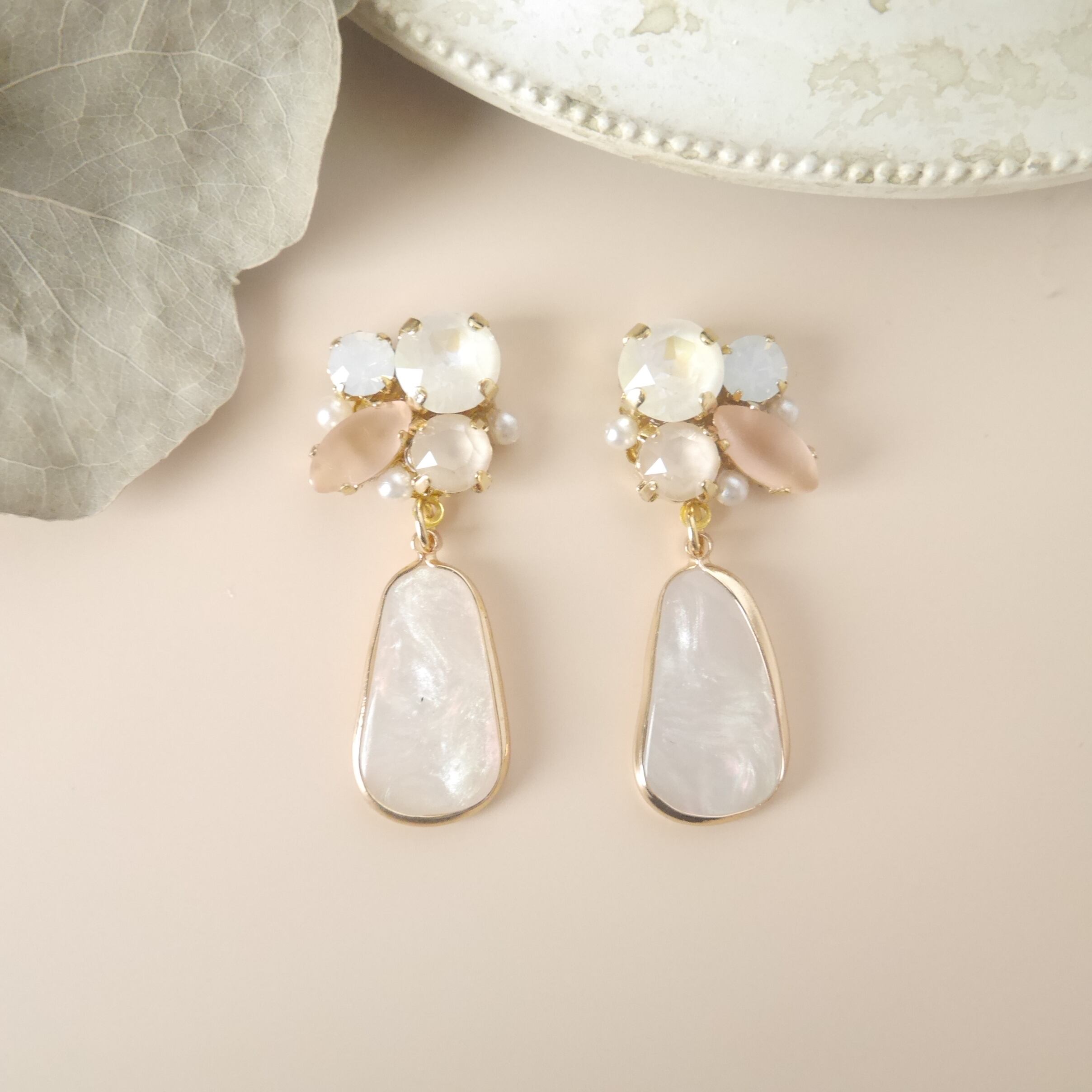 ホワイトとピンクでまとめ 淡い色合いがかわいいアクセサリーです。 高級感あるチャームで 大人フェミニンに仕上げました。 −−−−−−−−−−−−−−−−−−−−−− ※ご希望の金具をご選択ください。 ・ステンレスピアス ・真鍮イヤリング −−−−−−−−−−−−−−−−−−−−−− ▼サイズ 横1.5cm/縦4cm