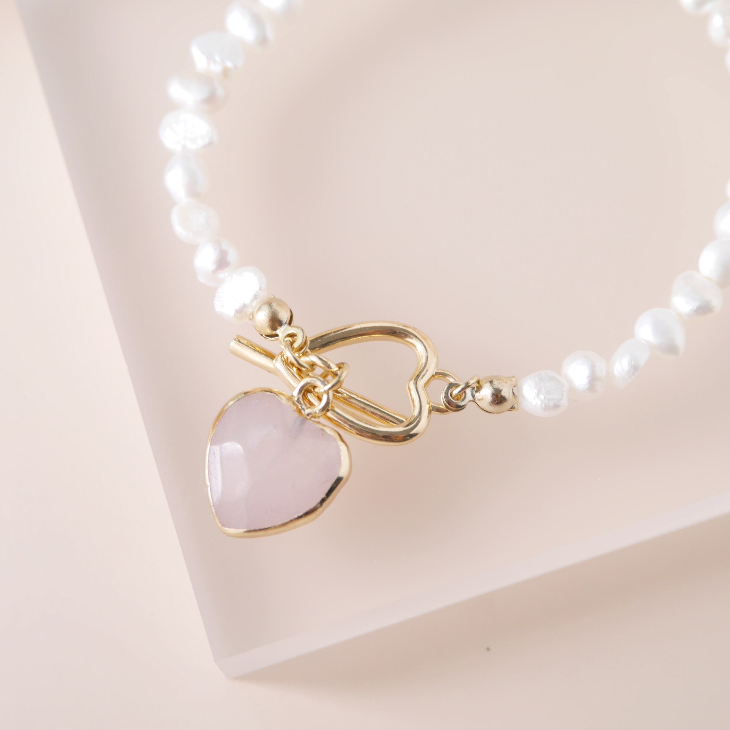 ハート天然石 × 淡水パールのブレスレット