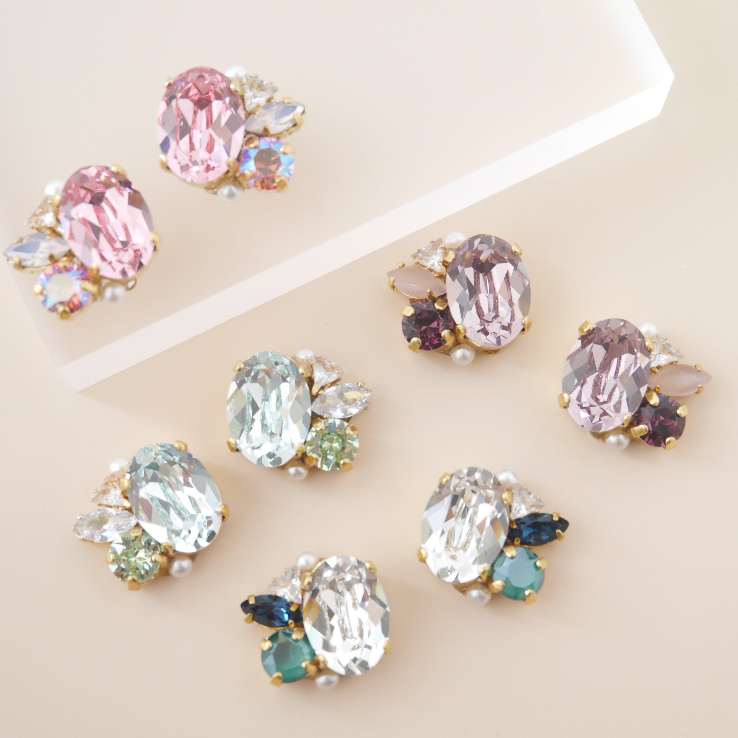 大粒のスワロフスキーがポイントのイヤリングです。 クリップタイプでゴムが付いているので 痛みや外れやすさなどは軽減されております。 現在はピンクのみとなります。 他のカラーやピアスご希望の方は 再販できるか確認しますので、お気軽にご相談ください。 −−−−−−−−−−−−−−−−−−−−−− ▼サイズ 横1.8cm×縦1.5cm